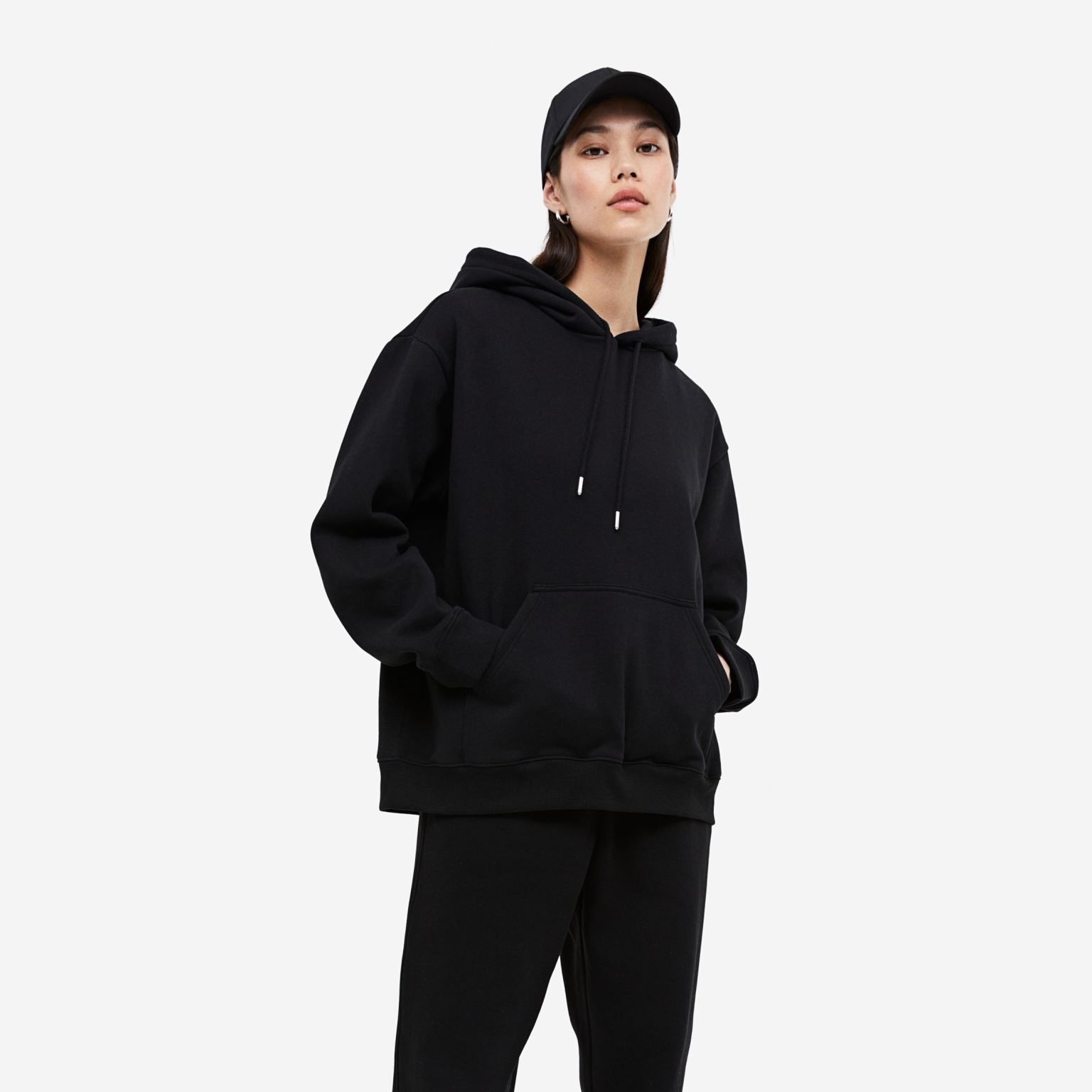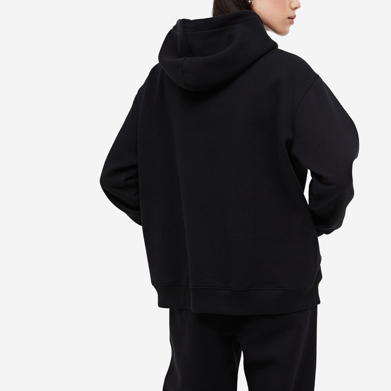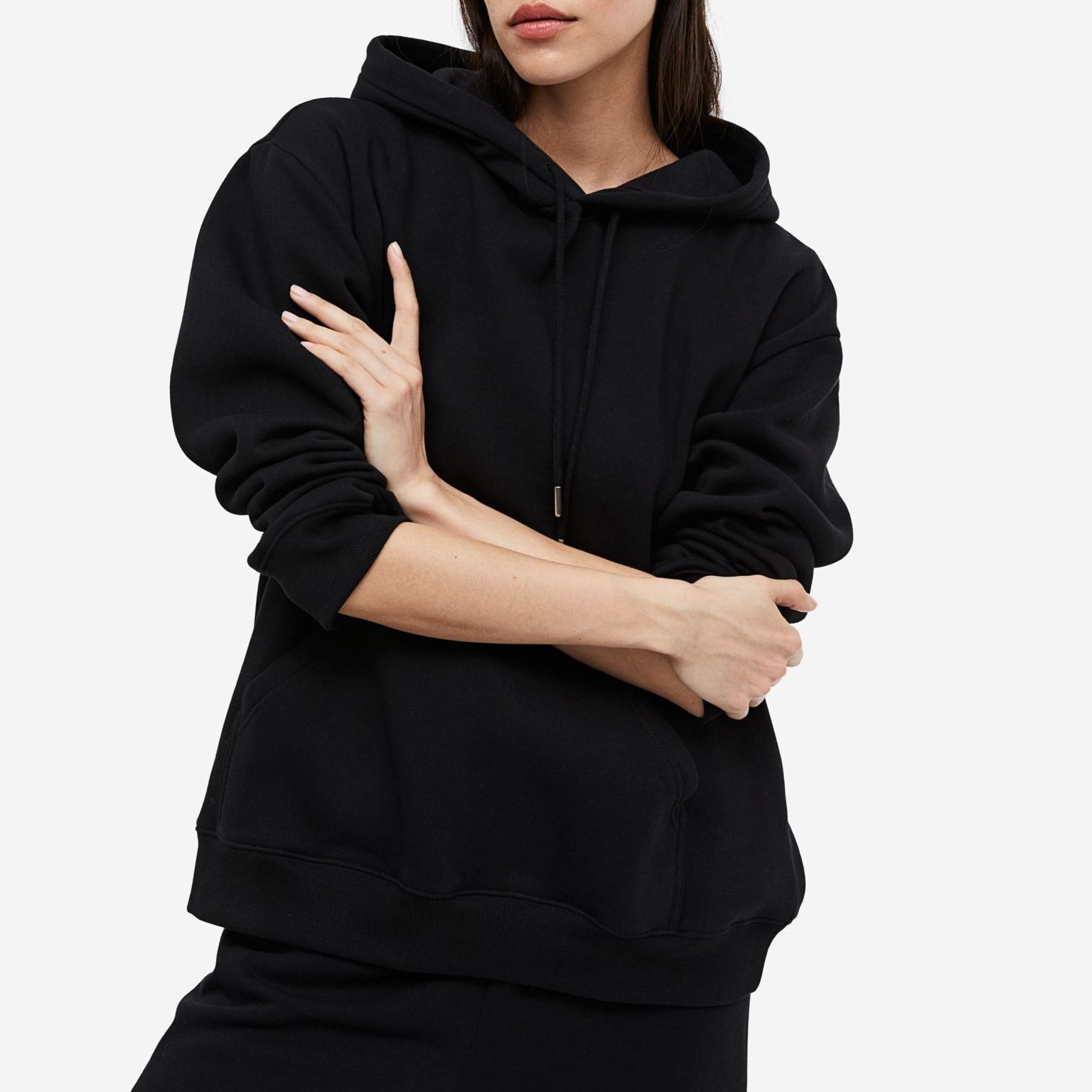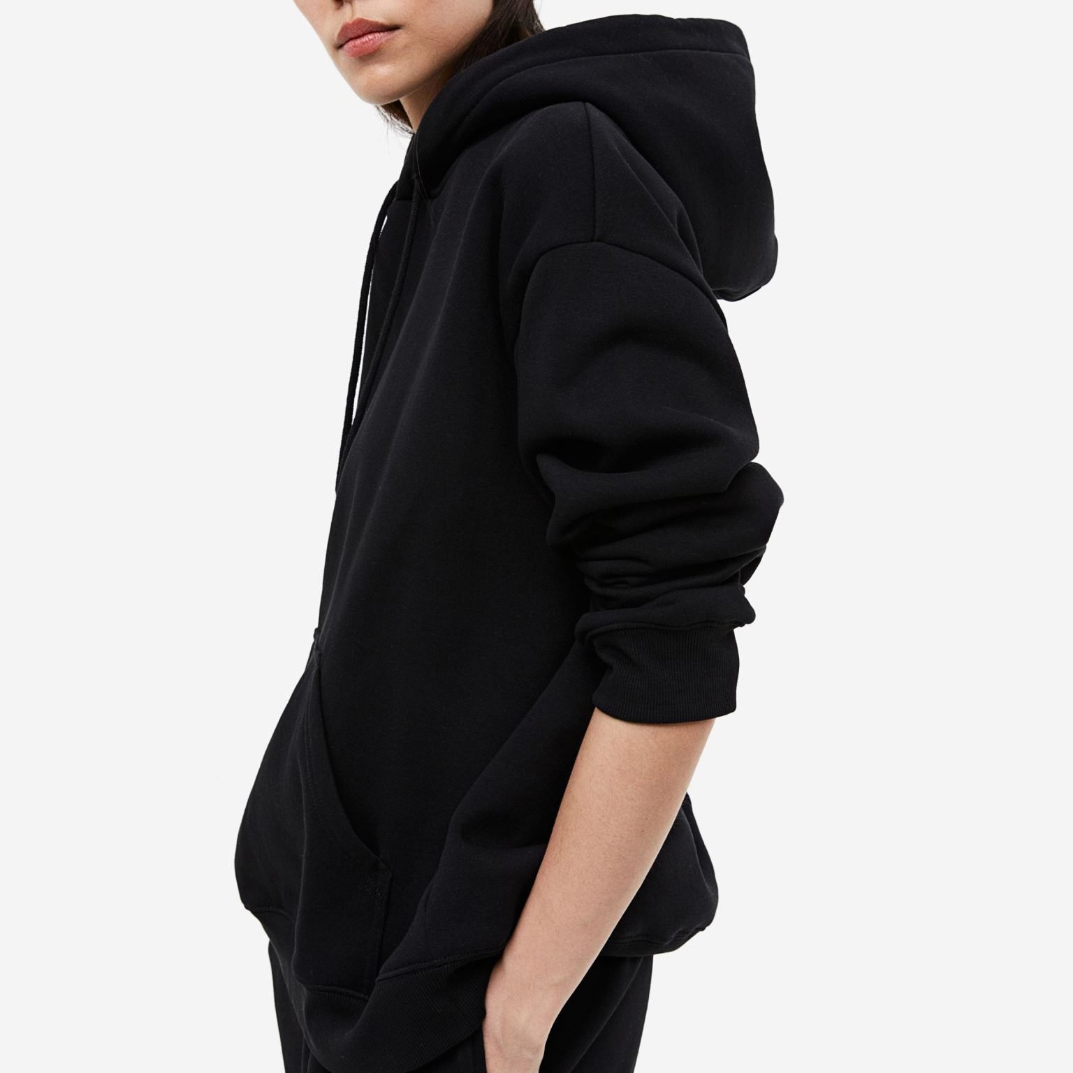Designed with a hood featuring adjustable drawstrings and a front pouch pocket, it blends practicality with a modern, laid-back look. Easy to pair with jeans, joggers, or leggings for versatile styling.