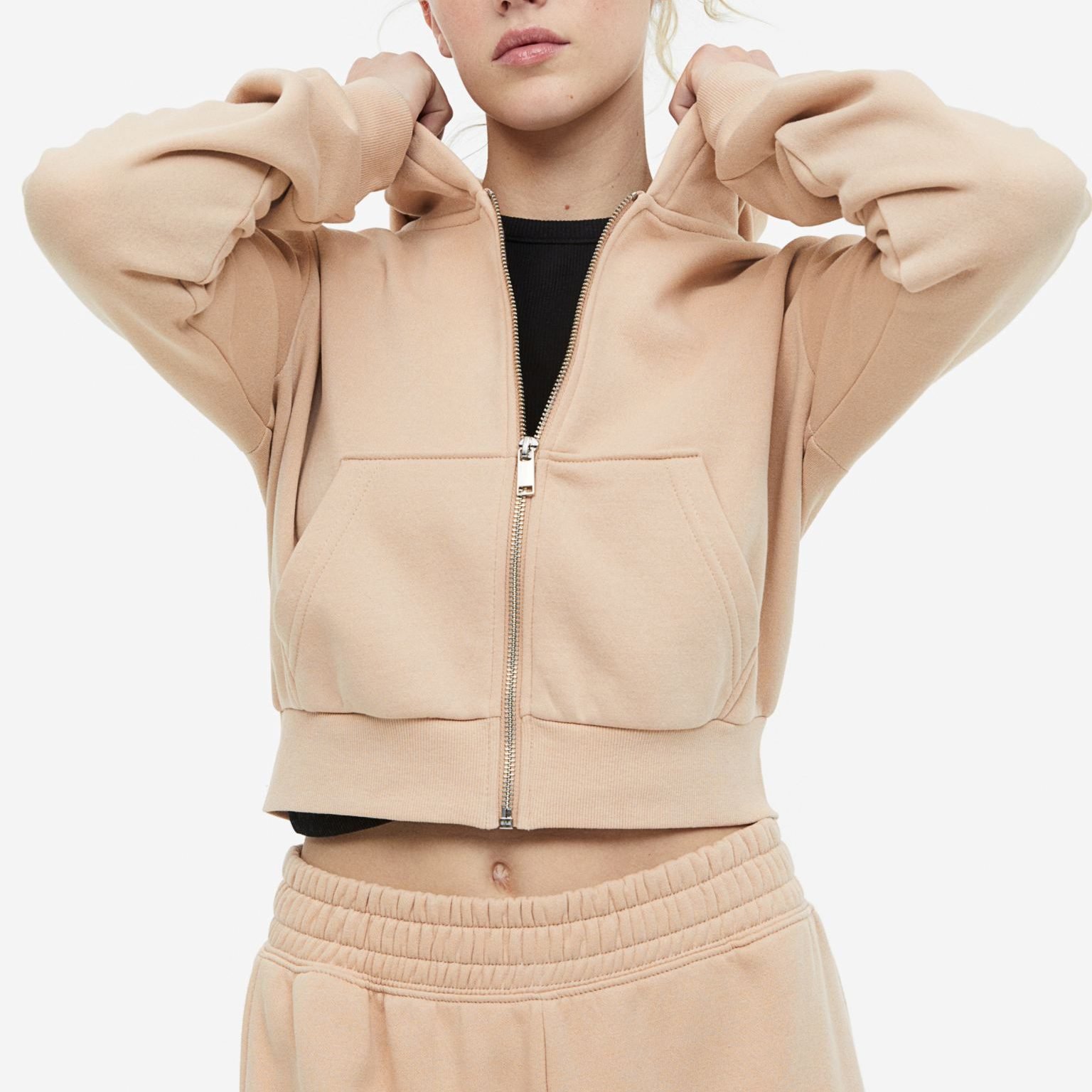 The front zipper closure, adjustable drawstring hood, and a handy front pouch pocket add both style and practicality, while the cropped length creates a trendy silhouette. Pair it effortlessly with jeans, joggers, or leggings for a chic and versatile look.